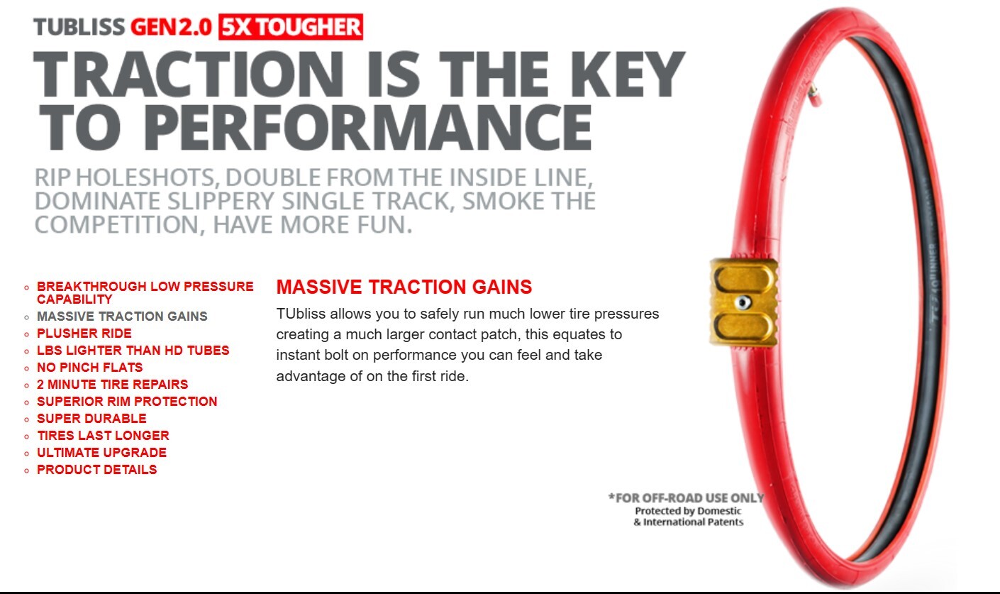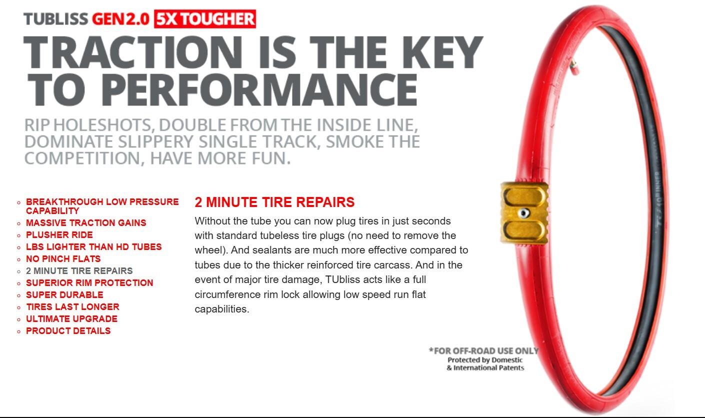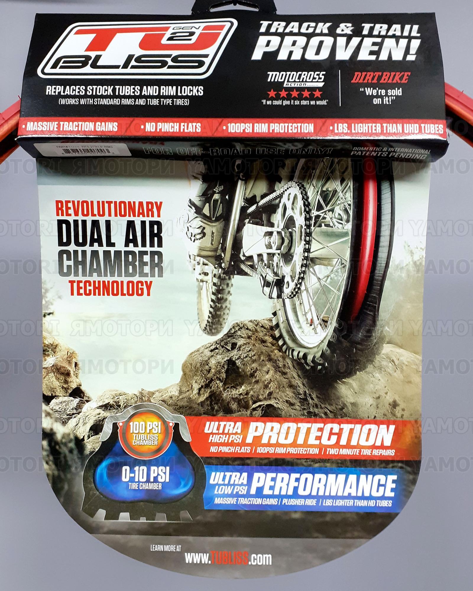 TUbliss заменяет обычные внутренние камеры небольшой красной вставкой с давлением до 100 фунтов на квадратный дюйм, в результате создает две разные зоны давления внутри самой шины. Это обеспечивает защиту обода и невероятную устойчивость к пробоям. Фактически вы получаете бескамерную шину на вашем мотоцикле кросс/эндуро.