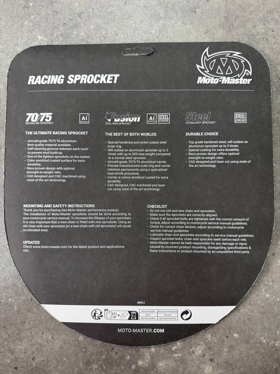 Задние звездочки Moto-Master Racing 7075 изготовлены по самым высоким стандартам, когда речь идет о материалах, современных производственных процессах и технологиях.